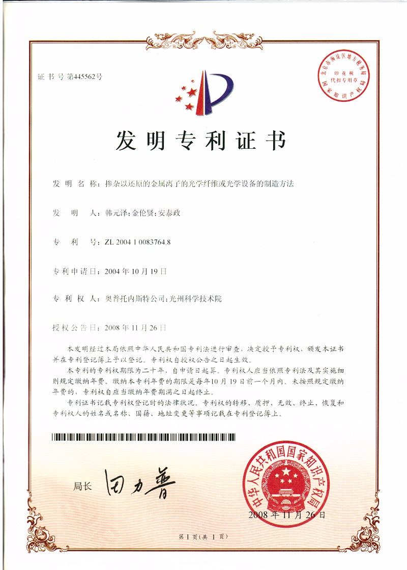 특허 | (중국) Method of fabricating optical fiber or optical device doped with …