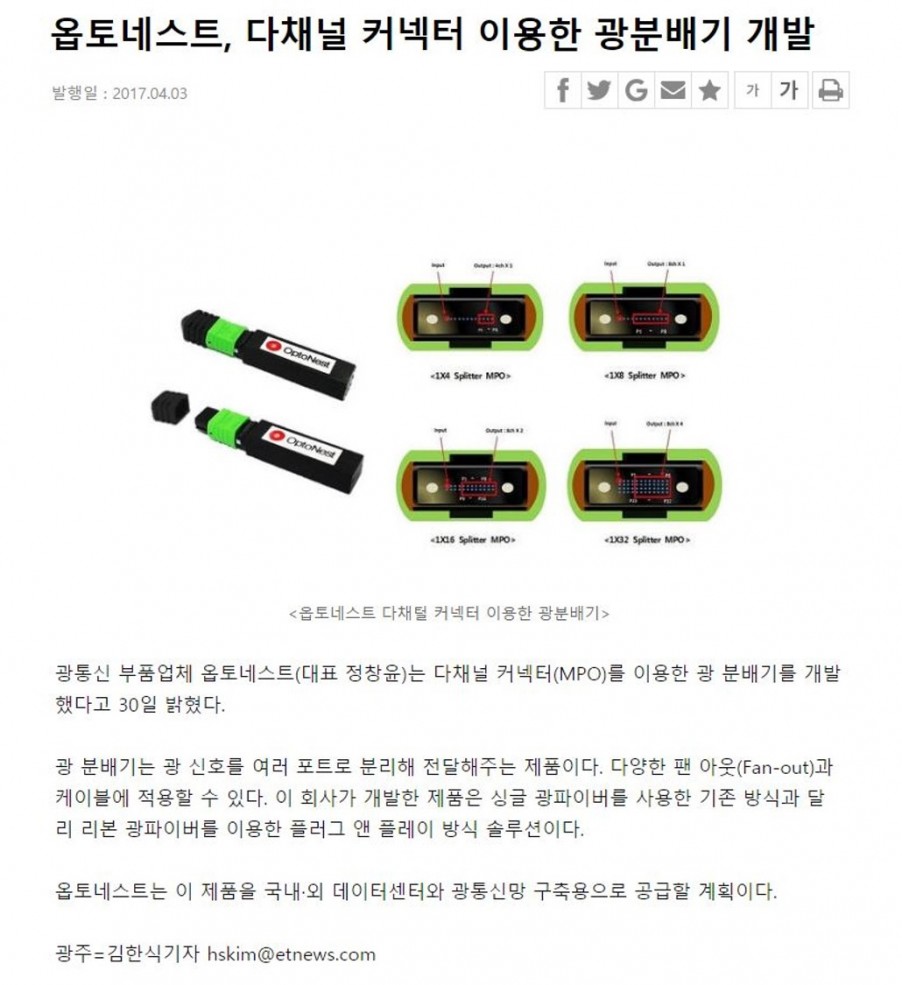 (주)옵토네스트의 신제품인 MPO Splitter가 최근 많은 관심을 받고 있으며, 이를 방증하는 많은 관련 기사들이 올라오고 있습니다.